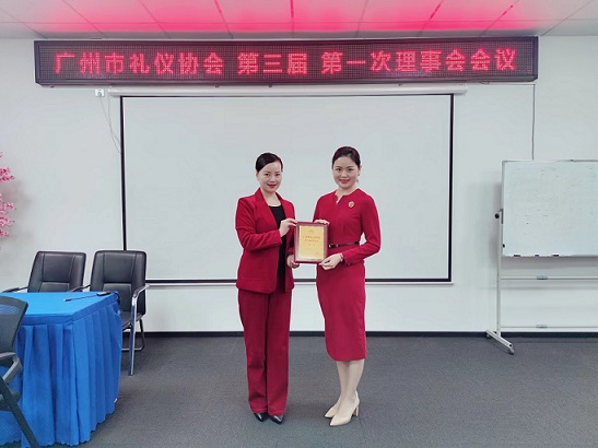 廣州市禮儀協(xié)會會長時(shí)淑妍女士為新任執(zhí)行會長彭莎女士頒發(fā)牌匾。