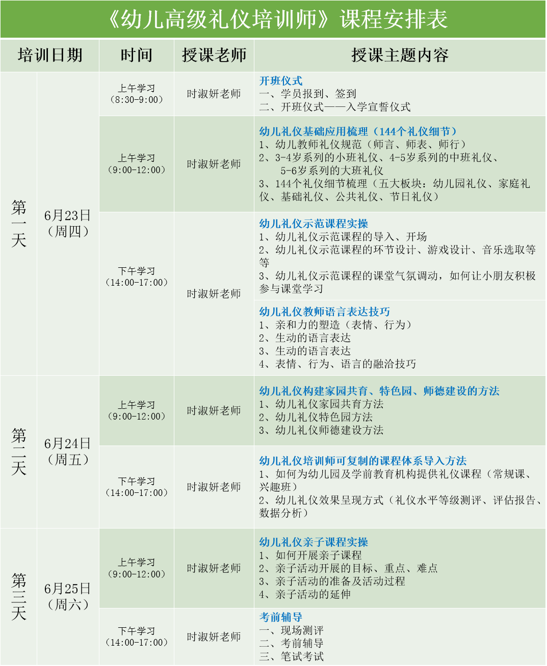 目前很多學(xué)前教育機(jī)構(gòu)、幼兒園已經(jīng)開展了禮儀課程,為了解決各地幼兒禮儀培訓(xùn)師資緊缺的問題,幫助幼兒禮儀教育工作者掌握禮儀教學(xué)訓(xùn)練內(nèi)容和教學(xué)規(guī)范、增強(qiáng)實(shí)際應(yīng)用授課能力、提高師資水平和質(zhì)量,建立專業(yè)幼兒禮儀培訓(xùn)教師隊(duì)伍,增強(qiáng)禮儀實(shí)際應(yīng)用及教育成果轉(zhuǎn)化,知行德禮教育、廣州市禮儀協(xié)會(huì)將于2022年6月23日--25日在廣州舉辦《高級(jí)幼兒禮儀培訓(xùn)師》詳情如下: