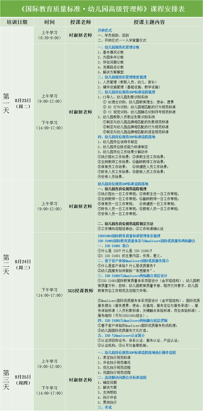 為了解決學(xué)前教育機(jī)構(gòu)管理人才培養(yǎng)、儲(chǔ)備的問題,幫助學(xué)前教育機(jī)構(gòu)管理工作體系化、流程化、標(biāo)準(zhǔn)化、專業(yè)化與國(guó)際接軌,廣州市禮儀協(xié)會(huì)、廣州市德禮教育將于2022年8月23日—25日在廣州開展《國(guó)際教育質(zhì)量標(biāo)準(zhǔn)化·幼兒園高級(jí)管理師》培訓(xùn)班。詳情如下: