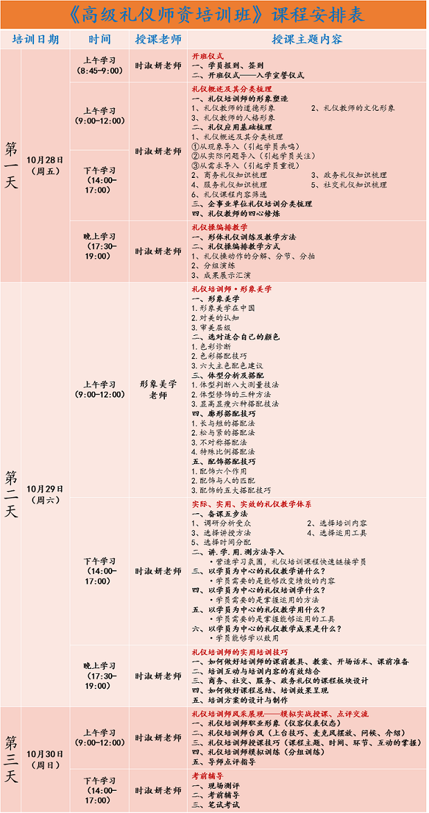 【每天上課時(shí)間安排如下】:10月28日(周五)開班儀式:8:45—9:00