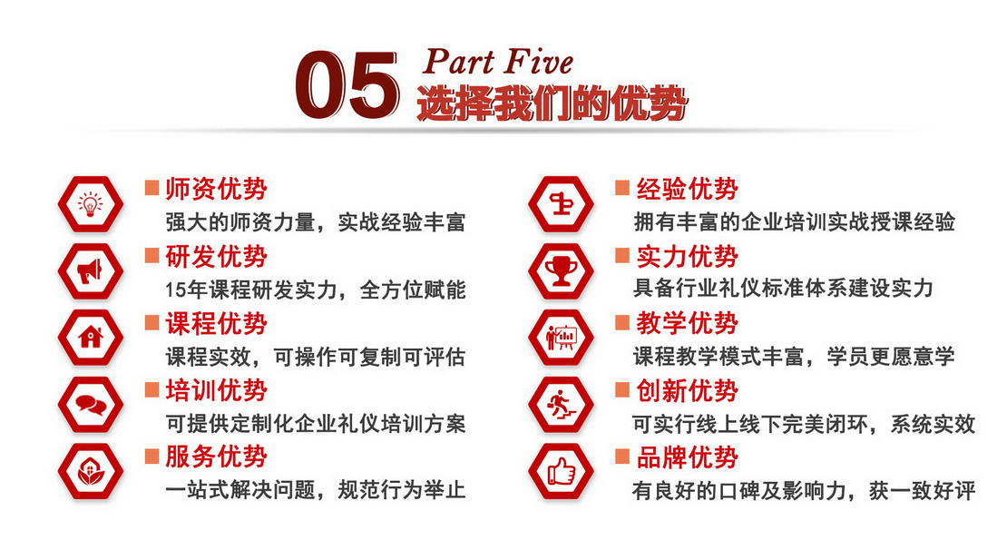研禮教育,致力于服務(wù)政府、企業(yè)和院校的禮儀文化交流、研討、培訓(xùn)以及禮儀學(xué)科建設(shè)等。研禮教育擁有一線精英講師已達(dá)150人,培訓(xùn)人次達(dá)100000+,培訓(xùn)高級(jí)禮儀培訓(xùn)師近千人,服務(wù)企業(yè)500+。教學(xué)培訓(xùn)根據(jù)培訓(xùn)對(duì)象的實(shí)際情況匹配最適合的師資。完整的教學(xué)體系,沉浸式的教學(xué)方法,科學(xué)的評(píng)估系統(tǒng),專業(yè)的服務(wù)團(tuán)隊(duì)成為企事業(yè)單位信賴的培訓(xùn)單位。