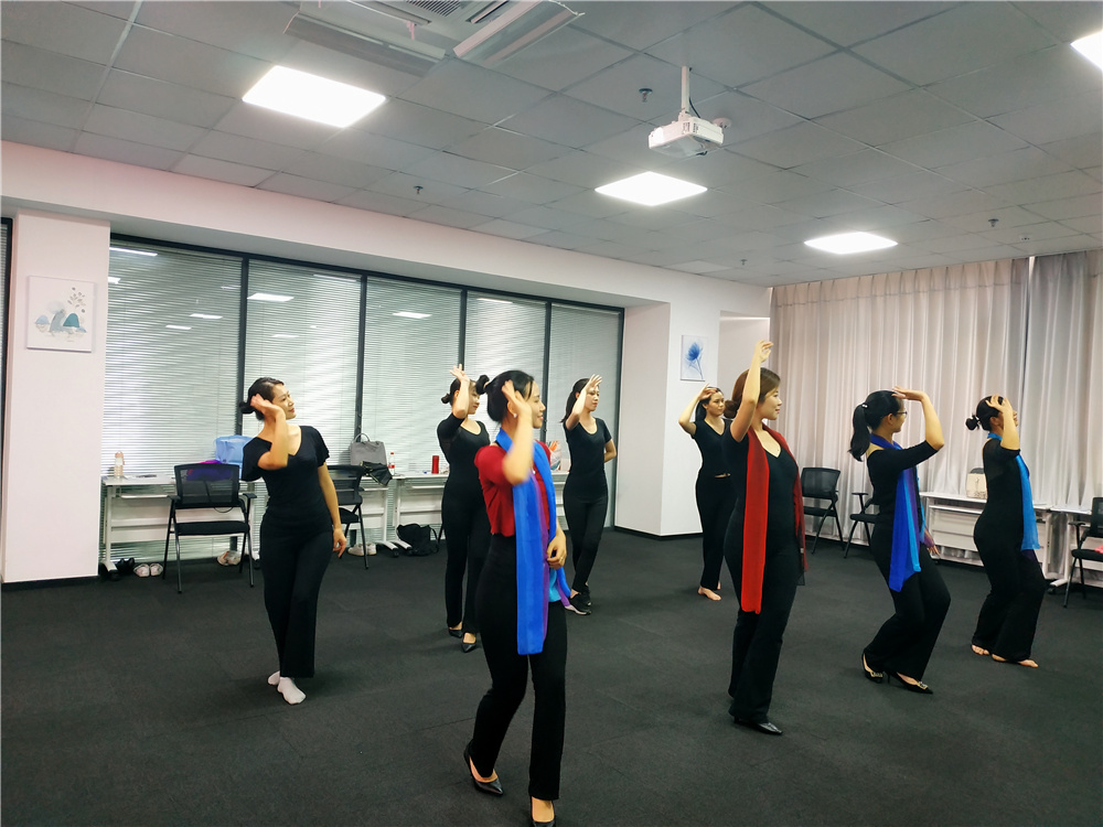 晚間學(xué)習(xí)時(shí)間段,由時(shí)淑妍老師講授《禮儀操編排教學(xué)》課程。在禮儀操編排教學(xué)課程開始前,時(shí)淑妍老師再次從禮儀行為規(guī)范:站姿、坐姿、走姿、蹲姿、指引、握手、遞接物品等禮儀細(xì)節(jié)進(jìn)行系統(tǒng)的梳理和指導(dǎo)。