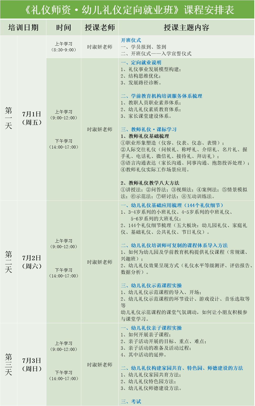 為加快高素質(zhì)禮儀培訓(xùn)師人才培養(yǎng)的步伐,增強禮儀培訓(xùn)師細分領(lǐng)域授課能力,全面提升禮儀培訓(xùn)師實際應(yīng)用解決問題能力,現(xiàn)面向以服務(wù)學(xué)前教育機構(gòu)(教職人員、幼兒、家長)的禮儀培訓(xùn)為職業(yè)發(fā)展方向人員,開展定向禮儀師資就業(yè)班。